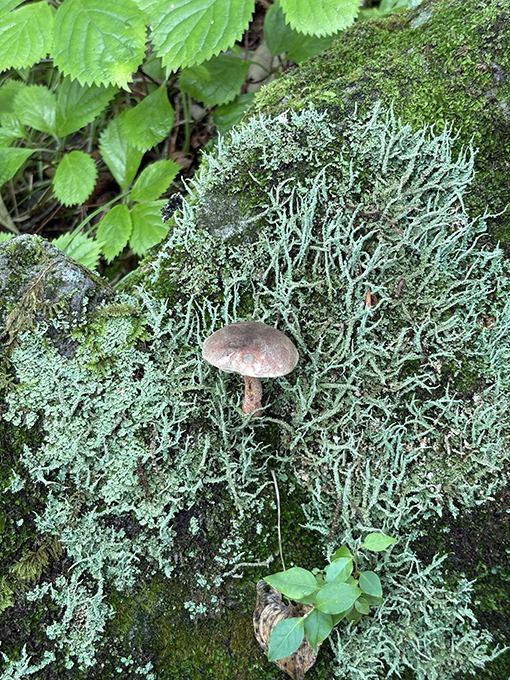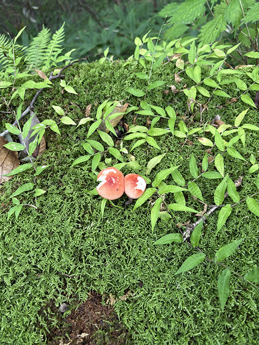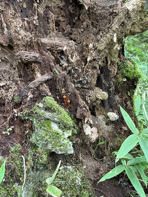 展望台からの帰りの登り道では、色鮮やかなきのこを探しながら。