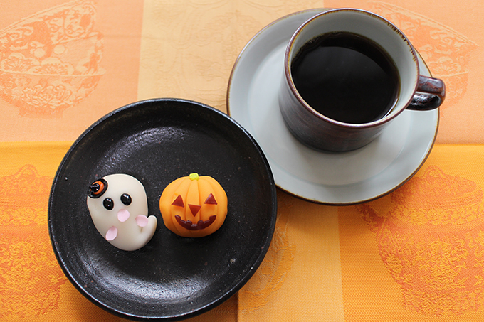 出先の百貨店でなにかハロウィンらしいお菓子をと、かぼちゃのジャック・オ・ランタンとおばけの上生菓子を。
